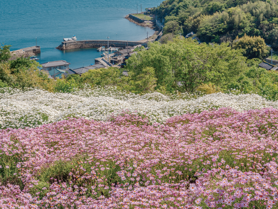 三豊市の離島・志々島に広がる「天空の花畑」。瀬戸内海を見下ろす色鮮やかな花々と青い海のコントラストは、まさに絶景!季節によって芝桜、ナデシコ、ネモフィラ、あじさいなどを楽しめます。心洗われる癒やしの一枚を。
