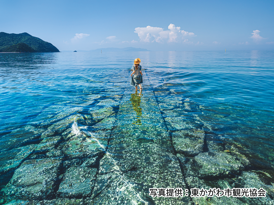 東かがわ市の「田の浦海岸」は、穏やかな瀬戸内海と美しい曲線を描く白い砂浜が魅力の隠れた絶景スポット。海岸に向かって右奥に進むと、海へと続く道が現れます。潮が満ち始める時間が撮影のベストタイミングです。