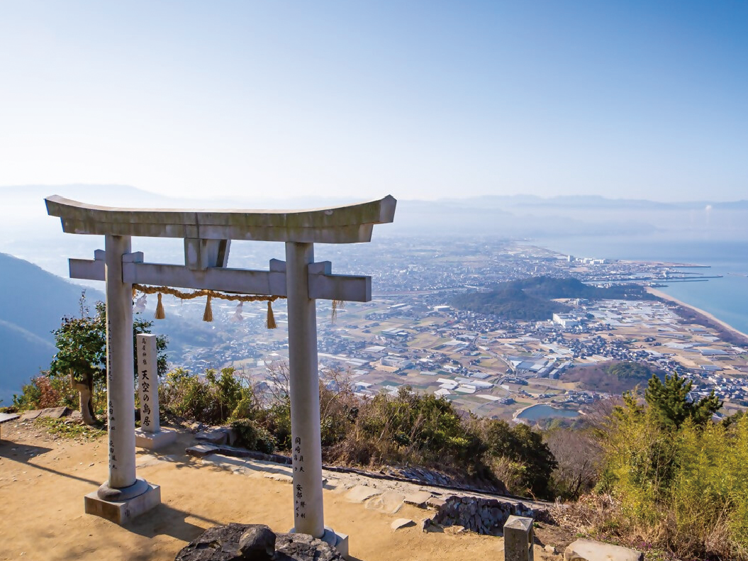 標高404mの稲積山の山頂に鎮座する「高屋神社」。本宮の鳥居越しに瀬戸内海と観音寺市街を一望できる、まさに「天空の鳥居」の名にふさわしい絶景スポットです。空に吸い込まれるようなブルーと鳥居のコントラストは、SNS映え間違いなし!